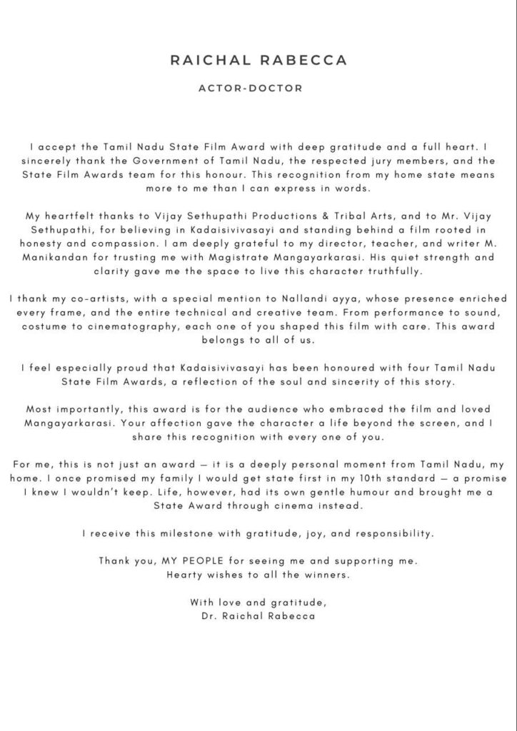 மதிப்பிற்குரிய இந்த அங்கீகாரத்திற்காக தமிழ்நாடு அரசுக்கும் படக் குழுவினருக்கும் மற்றும் மாநில திரைப்பட குழுவினருக்கும் என் மனமார்ந்த நன்றிகள். எனது தாய் மண்ணில் இந்த அங்கீகாரம் கிடைத்தது என்னால் வெறும் வார்த்தைகளால் விவரிக்க முடியாத அளவுக்கும் மிகையானது.