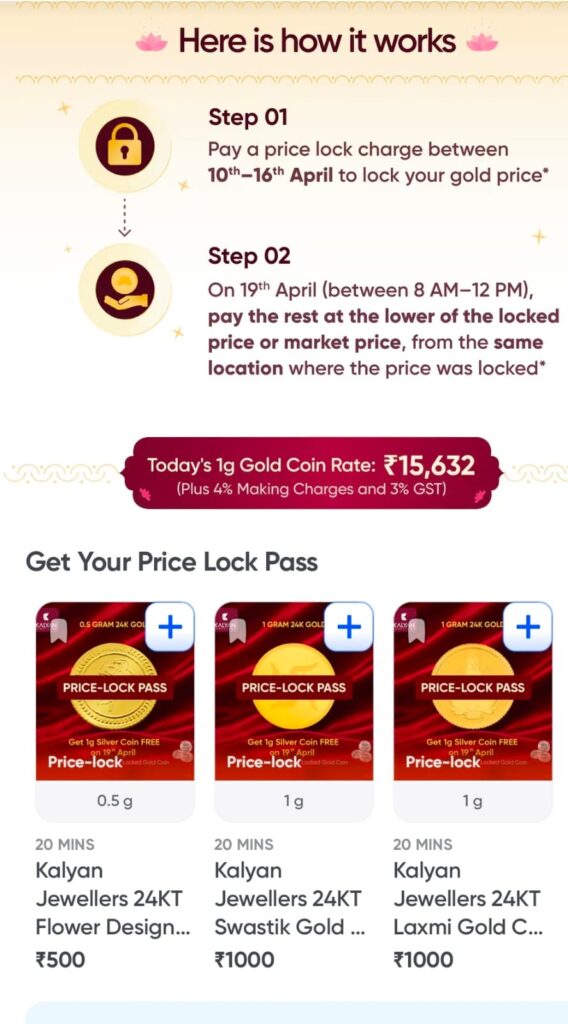 Between April 10 and April 16, 2026, consumers can select eligible Kalyan Jewellers gold coins on the Instamart app and pay 5% advance, starting from ₹500 for a 0.5 gm gold coin to prebook and take delivery on Akshaya Tritiya. On April 19, between 8:00 AM and 12:00 PM IST, they complete their purchase at the lower of the two prices – gold rate on the day of pre-booking or as per delivery date, whichever is lower. All prebook customers will also receive a free silver coin from Kalyan Jewellers.