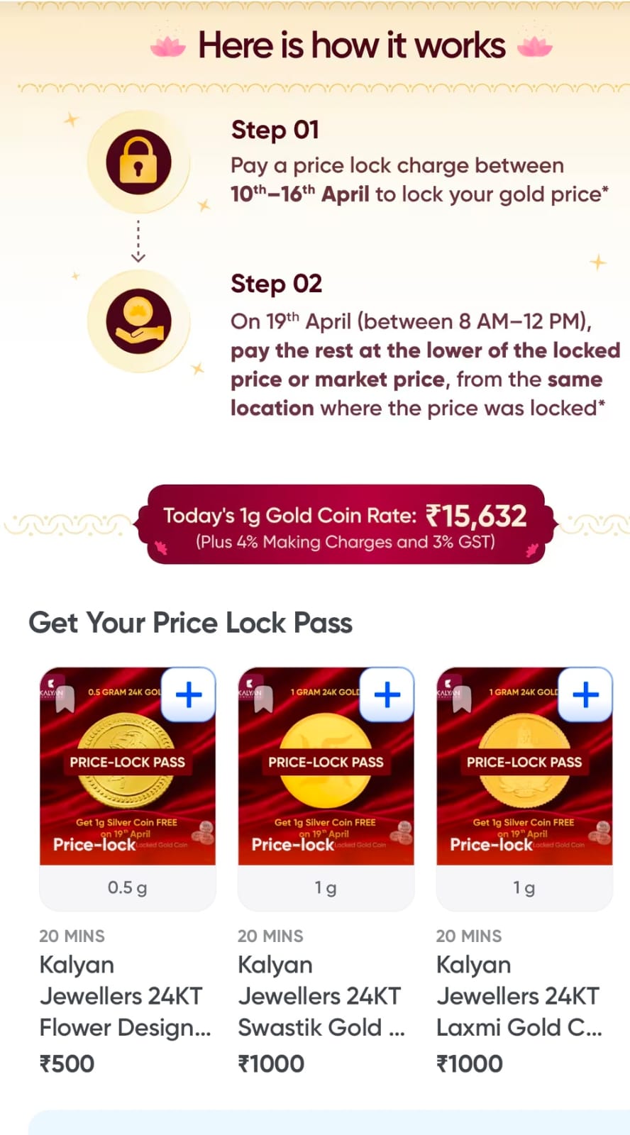 Gold Price Lock is a limited-period seller-led offer on select Kalyan Jewellers products listed on Instamart. A price-lock charge is required and will be adjusted against the final purchase made on April 19, 2026, between 8:00 AM and 12:00 PM IST. The final price will be the lower of the locked rate or prevailing market rate on the day. Offer, including a complimentary silver coin, is subject to availability and additional terms and conditions.